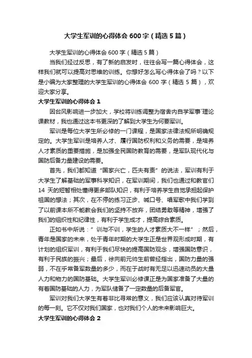 文档下载后可定制修改,请根据实际需要进行调整和使用,谢谢!并且,本店铺为大家提供各种类型的实用资料,如工作总结、工作报告、工作计划、心得体会、讲话致辞、教育教学、书信文档、述职报告、作文大全、其他资料等等,想了解不同资料格式和写法,敬请关注!Download tips: This document is carefully compiled by this editor.I hope that after you download it, it can help you solve practical problems. The document can be customized and modified after downloading, please adjust and use it according to actual needs, thank you!Moreover, our store provides various types of practical materials for everyone, such as work summaries, work reports, work plans, reflections, speeches, education and teaching, letter documents, job reports, essay summaries, and other materials. If you want to learn about different data formats and writing methods, please stay tuned!军训心得体会大学600字优秀6篇经历的事情不同,我们产生的看法也不同,一起来写心得体会吧,写心得就是把我们在的感受、收获、记录下来,以下是本店铺精心为您推荐的军训心得体会大学600字优秀6篇,供大家参考。