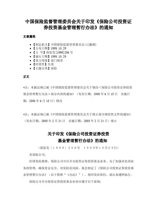 中国保险监督管理委员会关于印发《保险公司投资证券投资基金管理暂行办法》的通知文章属性•【制定机关】中国保险监督管理委员会(已撤销)•【公布日期】1999.10.29•【文号】保监发[1999]206号•【施行日期】1999.10.29•【效力等级】部门规章•【时效性】失效•【主题分类】保险正文*注:本篇法规已被《中国保险监督管理委员会关于修改<保险公司投资证券投资基金管理暂行办法>部分内容的通知》(发布日期:2000年6月15日实施日期:2000年6月15日)修改*注:本篇法规已被《中国保险监督管理委员会关于废止部分规范性文件的通知》(发布日期:2005年2月24日实施日期:2005年2月24日)废止关于印发《保险公司投资证券投资基金管理暂行办法》的通知(保监发〔1999〕206号1999年10月29日)各保险公司:经国务院批准,保险公司可以开办投资证券投资基金业务。