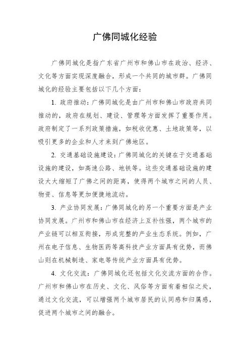 广佛同城的发展历程广佛同城是指广州和佛山两个城市的空间联系日益密切,形成了一个相互依存、相互支持、共同发展的城市群体。