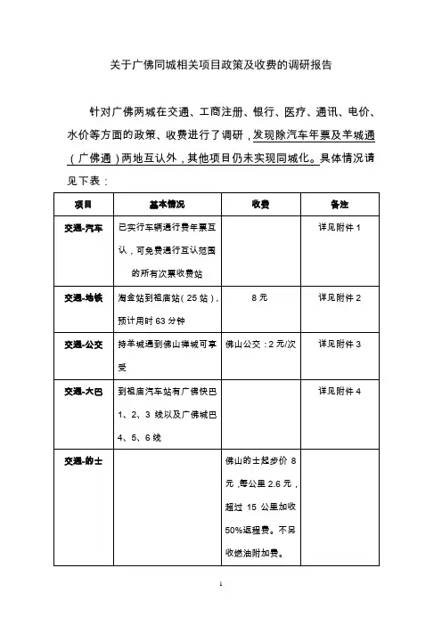 关于广佛同城相关项目政策及收费的调研报告针对广佛两城在交通、工商注册、银行、医疗、通讯、电价、水价等方面的政策、收费进行了调研,发现除汽车年票及羊城通(广佛通)两地互认外,其他项目仍未实现同城化。