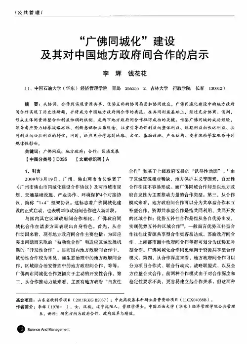 广佛同城新阶段面临的挑战与对策分析曾世华(广州工商学院,广东广州 510080)摘要:“广佛同城”作为一项以政府为主导的区域合作策略,两地多年的合作发展经验、相邻的地理位置优势、同为岭南文化的历史传承、层次衔接的城市产业布局以及两地强大的经济实力为广佛一体化的发展提供了坚实的基础,多年的合作使得广佛同城的发展进入到一个新阶段,规划建立三个广佛同城化合作示范区、强化两地交通的无缝连接、促进现代制造业的全面融合、提高两地环境保护合作和公共服务一体化的水平。