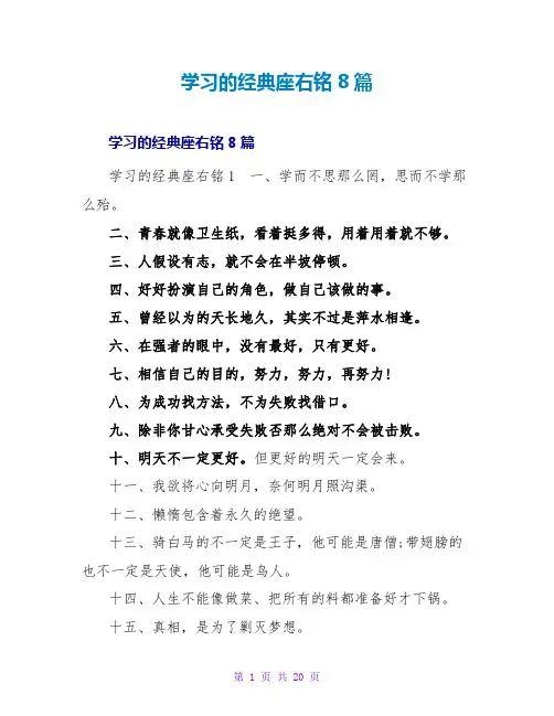 整理“经典的学习座右铭⼤全”,以供⼤家参考,希望可以帮助到⼤家,感谢⼤家的阅读与⽀持!经典的学习座右铭⼤全(1) 1、学习是苦根上长出来的甜果。
