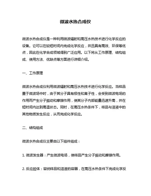 一、微波辅助合成技术的原理微波辅助合成技术是将微波辐射与传统化学反应技术相结合,利用微波辐射在催化反应体系中加热、促进催化剂与底物有效接触,促进反应速度以及提高反应的选择性。