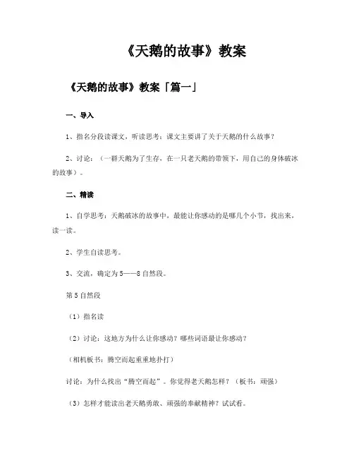 《天鹅的故事》教案《天鹅的故事》教案「篇一」一、导入1、指名分段读课文,听读思考:课文主要讲了关于天鹅的什么故事?2、讨论:(一群天鹅为了生存,在一只老天鹅的带领下,用自己的身体破冰的故事)。