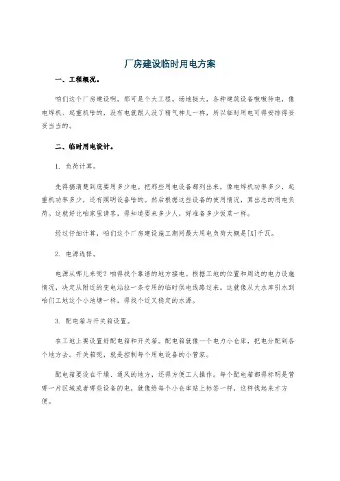 二、临时用电概况临时用电是指在建设工程施工期间,为了保障施工现场所需用电,安装了暂时性设施以满足施工现场用电需要。