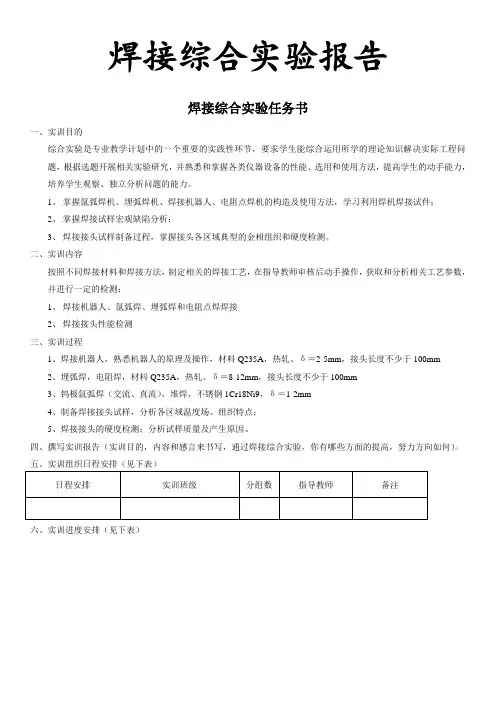 焊接综合实验报告焊接综合实验任务书一、实训目的综合实验是专业教学计划中的一个重要的实践性环节,要求学生能综合运用所学的理论知识解决实际工程问题,根据选题开展相关实验研究,并熟悉和掌握各类仪器设备的性能、选用和使用方法,提高学生的动手能力,培养学生观察、独立分析问题的能力。