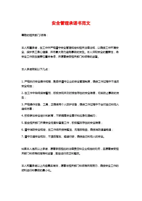 安全管理承诺书尊敬的领导:为了保障公司员工的人身安全和财产安全,改善工作环境,提高工作效率,确保公司持续、健康、稳定地运营,我谨向贵司管理层作出以下安全管理承诺:一、加强安全意识,确保员工安全作为公司的管理者,我将切实履行安全管理的责任,加强员工安全意识的培养,提高员工自我保护能力。