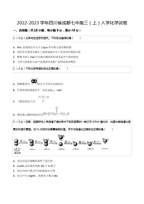 2022-2023学年四川省成都七中高三(上)入学化学试卷一、选择题(共15小题,每小题3分,满分45分)A.PM2.5是指粒径不大于2.5μm的可吸入悬浮颗粒物B.绿色化学要求从源头上消除或减少生产活动对环境的污染C.燃煤中加入CaO可以减少酸雨的形成及温室气体的排放D.天然气和液化石油气是我国目前推广使用的清洁燃料A.球棍模型为的分子可发生加成反应B.芳香烃的组成通式不一定是C n H2n-6(n≥6)C.三氟化氮电子式:D.聚羟基乙酸结构简式为3.(3分)近期,我国研究人员报道了温和条件下实现固氮的一类三元NiFeV催化剂,如图为其电催化固氮的机理示意图。