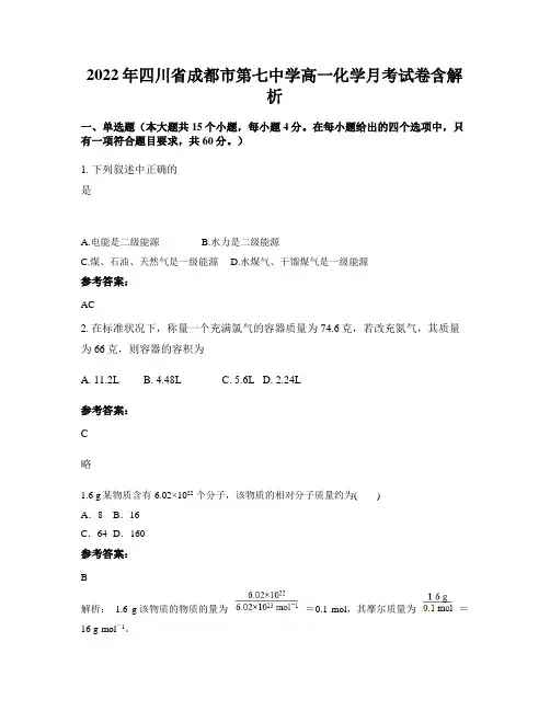 2022年四川省成都市第七中学高一化学月考试卷含解析一、单选题(本大题共15个小题,每小题4分。