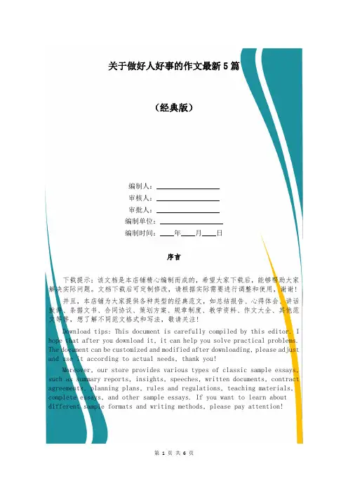 文档下载后可定制修改,请根据实际需要进行调整和使用,谢谢!并且,本店铺为大家提供各种类型的经典范文,如总结报告、心得体会、讲话致辞、条据文书、合同协议、策划方案、规章制度、教学资料、作文大全、其他范文等等,想了解不同范文格式和写法,敬请关注!Download tips: This document is carefully compiled by this editor. I hope that after you download it, it can help you solve practical problems. The document can be customized and modified after downloading, please adjust and use it according to actual needs, thank you!Moreover, our store provides various types of classic sample essays, such as summary reports, insights, speeches, written documents, contract agreements, planning plans, rules and regulations, teaching materials, complete essays, and other sample essays. If you want to learn about different sample formats and writing methods, please pay attention!关于做好人好事的作文最新5篇优秀的作文能够为读者提供新的观点和见解,如果平时没有充分积累素材,写作文就会成为一项令人头疼的任务,以下是本店铺精心为您推荐的关于做好人好事的作文最新5篇,供大家参考。