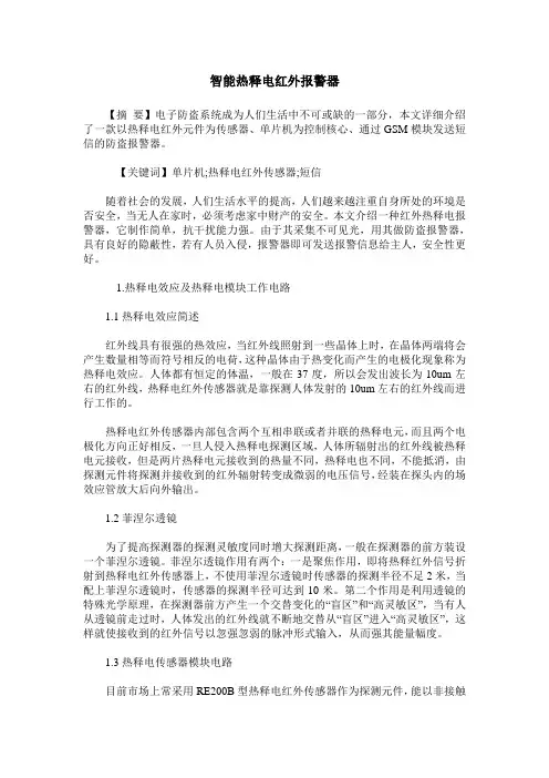 智能热释电红外报警器【摘要】电子防盗系统成为人们生活中不可或缺的一部分,本文详细介绍了一款以热释电红外元件为传感器、单片机为控制核心、通过GSM模块发送短信的防盗报警器。