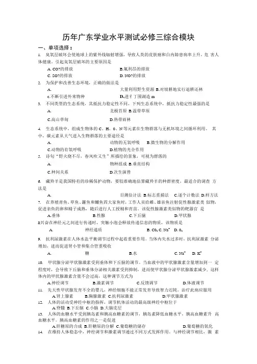 历年广东学业水平测试必修三综合模块一、单项选择I1.臭氧层破坏会使地球上的紫外线辐射增强,导致人类的皮肤癌和白内障患病率上升,危害人体健康。