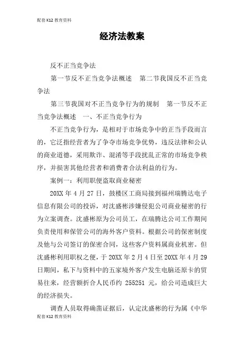 一、教案基本信息1. 课程名称:经济法反不正当竞争法2. 课时安排:45分钟3. 教学对象:高中阶段学生4. 教学目标:使学生了解反不正当竞争法的基本概念、原则和主要内容,提高学生的经济法律意识。