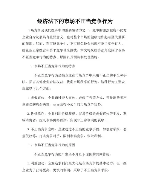 三、市场不正当竞争行为的预防与处理针对市场不正当竞争行为,经济法提出了一些预防和处理措施,旨在维护市场公平竞争和正常秩序。