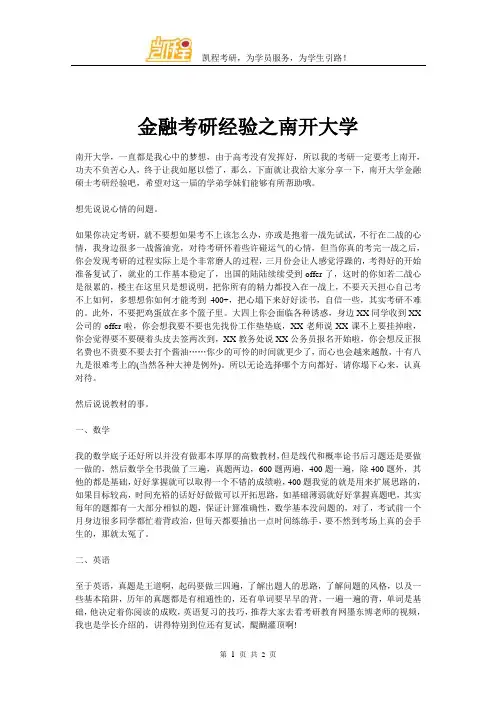 6.南开大学金融专硕考研经验谈(1)鲁同学考研经验01考研信息报考专业院校:南开大学国际商务本科院校专业:天津师范大学考研初试成绩:政治80分,英语71分,数学135分,专业课115分,总分401。