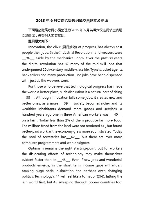 题目原文如下:Innovation, the elixir (灵丹妙药) of progress, has always cost people their jobs. In the Industrial Revolution hand weavers were ___36___ aside by the mechanical loom. Over the past 30 years the digital revolution has 37 many of the mid-skill jobs that underpinned 20th-century middle-class life. Typists, ticket agents, bank tellers and many production-line jobs have been dispensed with, just as the weavers were.For those who believe that technological progress has made the world a better place, such disruption is a natural part of rising ___38___. Although innovation kills some jobs, it creates new and better ones, as a more ___39___ society becomes richer and its wealthier inhabitants demand more goods and services. A hundred years ago one in three American workers was ___40___ on a farm. Today less than 2% of them produce far more food. The millions freed from the land were not rendered 41 , but found better-paid work as the economy grew more sophisticated. Today the pool of secretaries has___42___, but there are ever more computer programmers and web designers.Optimism remains the right starting-point, but for workers the dislocating effects of technology may make themselves evident faster than its ___43___. Even if new jobs and wonderful products emerge, in the short term income gaps will widen, causing huge social dislocation and perhaps even changing politics. Technology's 44 will feel like a tornado (旋风), hitting the rich world first, but 45 sweeping through poorer countries too.No government is prepared for it.参考译文:发明创新被视为进步的灵丹妙药,却使很多人失去了自己的工作。