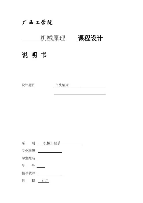广西工学院鹿山学院机械原理课程设计说明书题目牛头刨床系别机械工程系专业班级机制082学生姓名欧浪学号20082309指导教师傅胜华日期2011.4.16牛头刨床中导杆机构的运动分析及动态静力分析第一章机械原理课程设计的目的和任务1课程设计的目的:机械原理课程设计是高等工业学校机械类学生第一次全面的机械运动学和动力学分析与设计的训练,是本课程的一个重要教学环节。