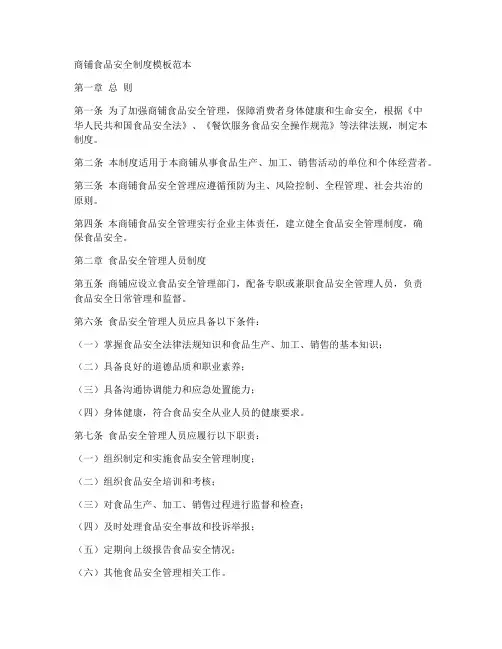 一、制度总则为保障消费者饮食安全,维护店铺形象,根据《中华人民共和国食品安全法》及相关法律法规,特制定本制度。