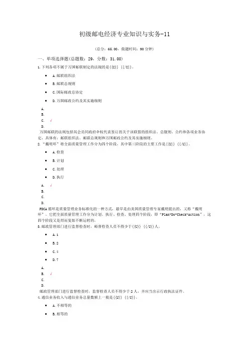 初级邮电经济专业知识与实务-11(总分:65.00,做题时间:90分钟)一、单项选择题(总题数:29,分数:31.00)1.下列各项不属于万国邮联制定的法规的是{{U}} {{/U}}。