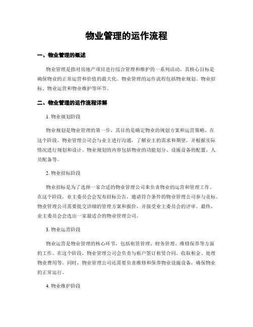 二、物业管理的运作流程详解1. 物业规划阶段物业规划是物业管理的第一步,其目的是确定物业的规划方案和运营策略。