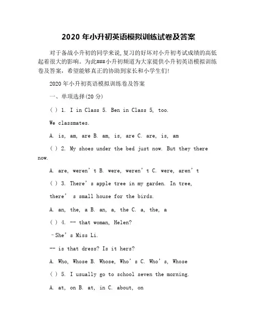 为此###小升初频道为大家提供小升初英语模拟训练卷及答案,希望能够真正的协助到家长和小学生们!2020年小升初英语模拟训练卷及答案一、单项选择(20分)( ) 1. I in Class 5. Ben in Class 5, too.We classmates.A. is, am, areB. am, is, areC. are, is, am( ) 2. My shoes under the bed just now. But they there now.A. are, weren’tB. were, weren’tC. were, aren’t( ) 3. There’s apple tree in my garden. In tree,there’ s small house for the birds.A. an, the, aB. an, a, theC. a, the, a( ) 4. -- that woman, Helen?–She’s Miss Li.-- is that dress? Is it hers?A. Who, WhoseB. Whose, Who’sC. Who’s, Whose( ) 5. I usually go to school seven the morning.A. at, onB. at, inC. about, on( ) 6. This is our classroom. is next to .A. Your, ourB. Your, oursC. Yours, ours( ) 7. Mr White is from . He’s . He speaks .A. America, American, EnglishB. American, America,English C. America, American, American( ) 8. I a big garden behind my house. many flowers in it.A. have, There areB. there are, HaveC. has, There is( ) 9. There isn’t milk in the cup. Would you like juice?A. some, anyB. any, someC. any, any( ) 10. - Yang Ling see a film last Sunday? - No, she .A. Do, don’tB. Does, doesn’tC. Did, didn’t( ) 11. –What does “No parking” mean? - It means .A. We can park our bikes here.B. We can’t park ourbikes here. C. We can’t ride our bikes here.( ) 12. –This is an exciting holiday. People usuallymake pumpkin lanterns and go to parties. Children wear(穿,戴) masks and dress up in costumes. What holiday is it? - It’s .A. HalloweenB. EasterC. Christmas( ) 13. –What’s your _____? -- I like listening to music.A. nameB. hobbyC. job( ) 14. – Where ______ your friend live? -- She ____in London.A. do, liveB. does, livesC. is, live( ) 15. Can you Chinese ? No, but I often with my friends Chinese.A. tell, say, atB. speak, talk, inC. speak, tell, in( ) 16. What can you in the picture? I at it, but Ican’t any thing.A. look, look, look forB. see, see, look forC. see, look, find( ) 17. Which season you like ? I like spring better.A. did, bestB. do, bestC. do, better( ) 18. Look, there’s apple tree. tree is very tall. You can see cat under it.A. an, A, theB. an, The, aC. a, The, a( ) 19. In winter, it often snows, It’s best season.A. the, theB. a, theC.\, the( ) 20. Tom is in Class One, Jim is in Class Two, they are inA. the same classB. the same rowC. different classes二、完型填空(10分)I __1__ a bad cough and a high fever. So I didn’t go school __2__morning. After breakfast, I__3__ a storybook. There’re many signs __4__ it. From this book I know __5__ about traffic(交通).We should walk or drive on the __6 __ of the road(路)and get slower(慢下来)at the cross of the road.。