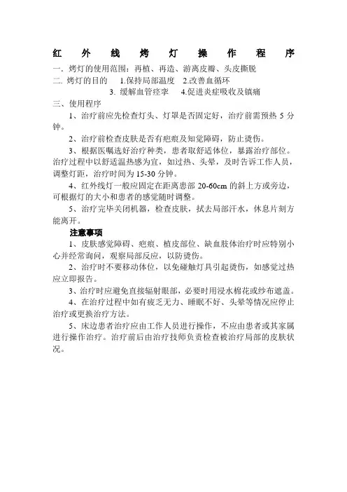 六、注意事项1. 请勿在任何可燃物附近使用红外线烤灯,以避免火灾的发生。