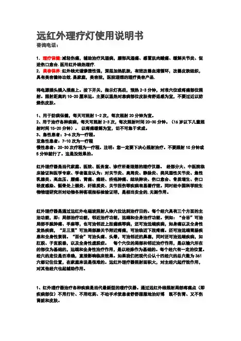 7 .护理及注意事项使用时严禁触摸照射头网罩内的治疗板和其它几件,以免被烫伤或引起触电事故。