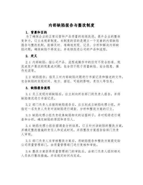 内部缺陷报告与整改制度1. 背景和目的为了确保企业的正常运营和产品质量的连续改进,提升企业的整体竞争力,订立本规章制度。