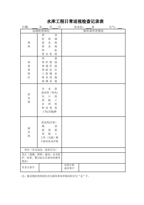 以上为水库巡查记录表,希望大家能够认真执行,确保水库的安全运行。