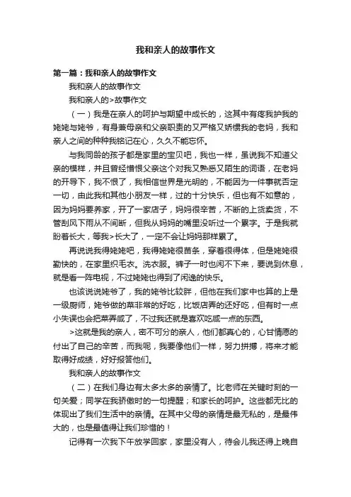 我和亲人的故事作文第一篇:我和亲人的故事作文我和亲人的故事作文我和亲人的>故事作文(一)我是在亲人的呵护与期望中成长的,这其中有疼我护我的姥姥与姥爷,有身兼母亲和父亲职责的又严格又娇惯我的老妈,我和亲人之间的种种我铭记在心,久久不能忘怀。