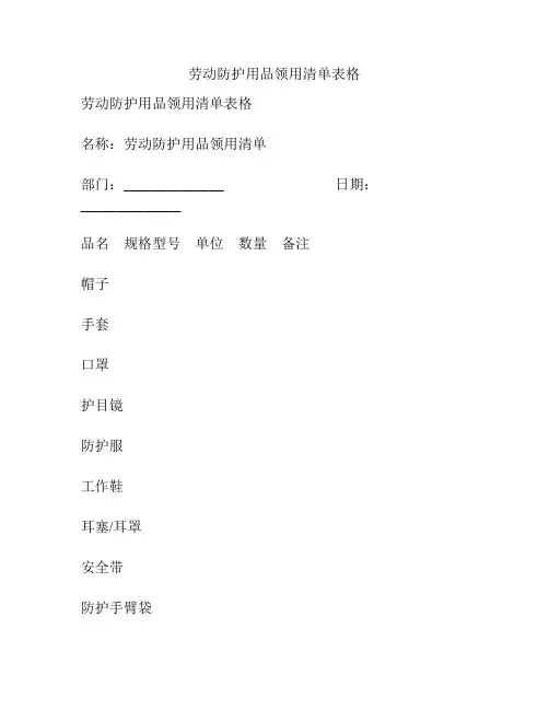 --------------------------------------------------------------------------------------------------------------------劳动防护用品领用登记表部门名称:____________________领用日期:____________________领用人员姓名:____________________工号:____________________领用用途:____________________序号防护用品名称型号/规格颜色/尺码单位数量备注1 安全帽型号A 黄色个 5 领用人员需长时间在施工现场工作,需要配备安全帽2 防护手套规格B 蓝色双 10 进行机械维修作业时需要使用防护手套3 防尘口罩型号C 无色个 20 在粉尘较多的场所工作需要使用防尘口罩说明:请务必按照实际使用情况登记领用情况,严禁私自转借、私自拆卸防护用品。
