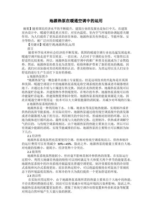 【关键词】暖通空调;地源热泵;运用前言随着科学技术和社会经济的不断发展,我国的暖通空调行业也迅猛发展起来,暖通空调开始走进平常百姓家。