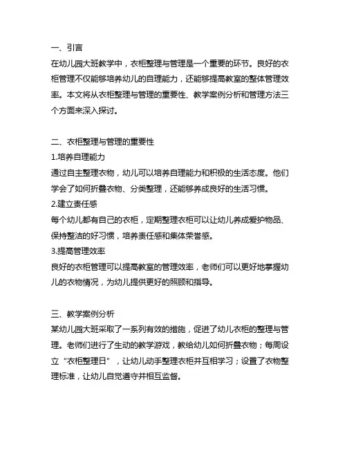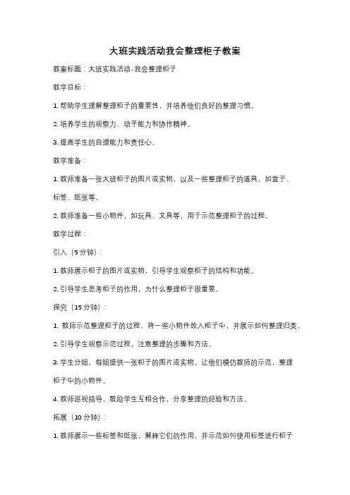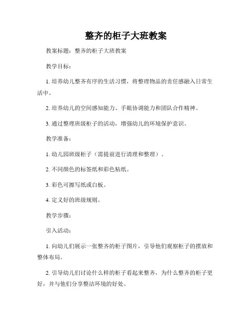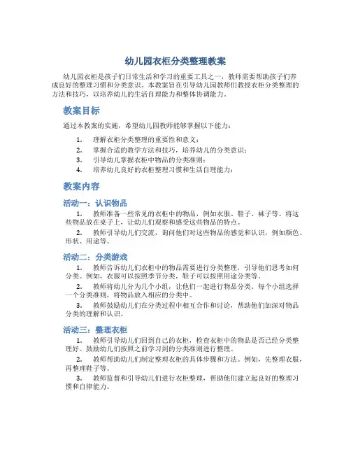 教案步骤:引入活动:1. 创设情境:与幼儿一起观察整齐的衣柜和杂乱的衣柜,引导幼儿思考整理衣柜的重要性。