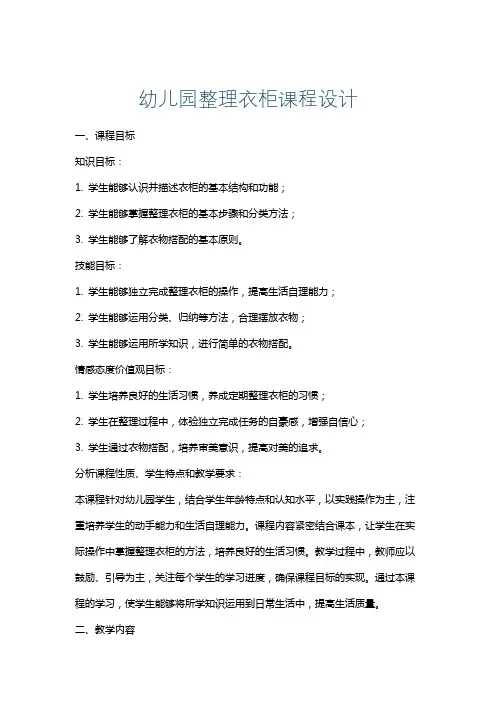 教学评价1.观察幼儿在整理衣柜过程中的参与度和自理能力表现。