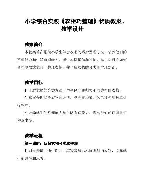 小学综合实践《衣柜巧整理》教案教学设计教案一:小学综合实践《衣柜巧整理》一、教学目标:1.知识目标:了解衣柜整理的重要性,掌握衣物分类和整理的方法。