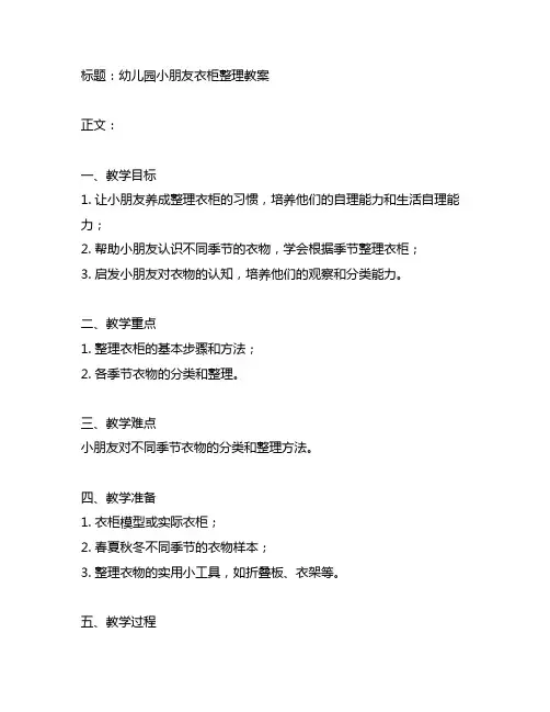 标题:幼儿园小朋友衣柜整理教案正文:一、教学目标1. 让小朋友养成整理衣柜的习惯,培养他们的自理能力和生活自理能力;2. 帮助小朋友认识不同季节的衣物,学会根据季节整理衣柜;3. 启发小朋友对衣物的认知,培养他们的观察和分类能力。