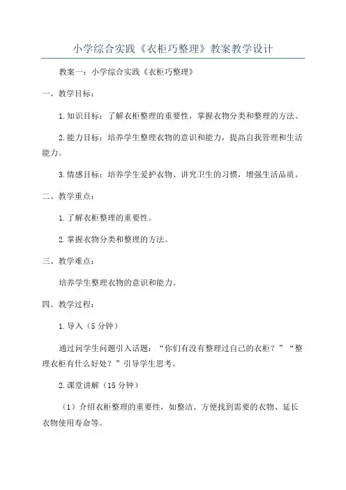教学设计二:小学综合实践《衣柜巧整理》一、教学目标:1.知识目标:了解衣柜整理的重要性,掌握衣物分类和整理的方法。