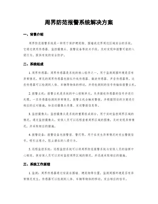 二、系统组成1. 周界传感器:周界传感器是系统的核心组件之一,用于监测周围环境是否有异常情况。