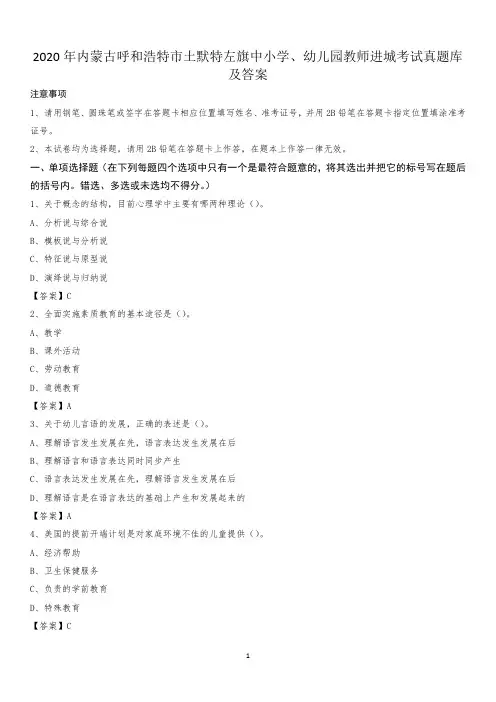2020年内蒙古呼和浩特市土默特左旗中小学、幼儿园教师进城考试真题库及答案注意事项1、请用钢笔、圆珠笔或签字在答题卡相应位置填写姓名、准考证号,并用2B铅笔在答题卡指定位置填涂准考证号。