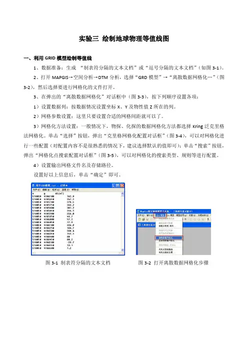 实验三绘制地球物理等值线图一、利用GRID模型绘制等值线1、数据准备:生成“制表符分隔的文本文档”或“逗号分隔的文本文档”(如图3-1)。