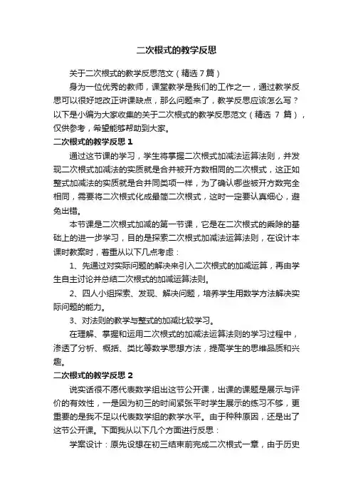 二次根式的教学反思关于二次根式的教学反思范文(精选7篇)身为一位优秀的教师,课堂教学是我们的工作之一,通过教学反思可以很好地改正讲课缺点,那么问题来了,教学反思应该怎么写?以下是小编为大家收集的关于二次根式的教学反思范文(精选7篇),仅供参考,希望能够帮助到大家。