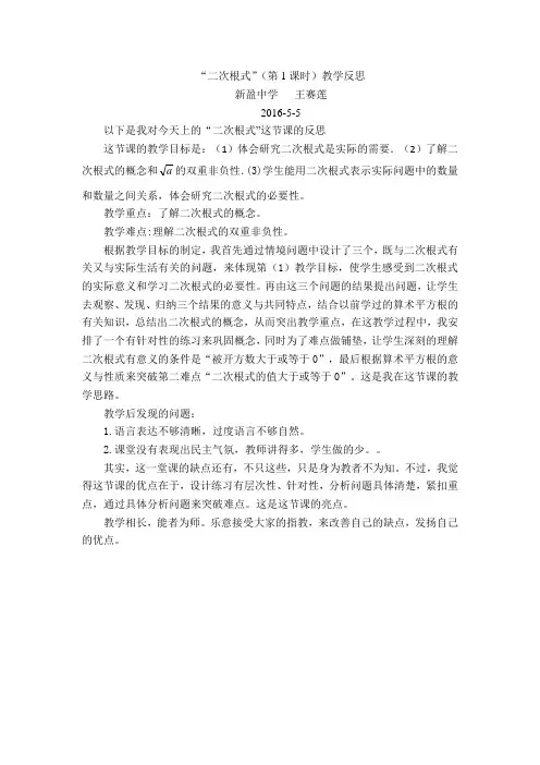 四、教学方法的选择不够多样在二次根式的教学中,教学方法的选择也是需要反思的一点。