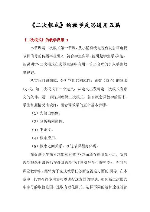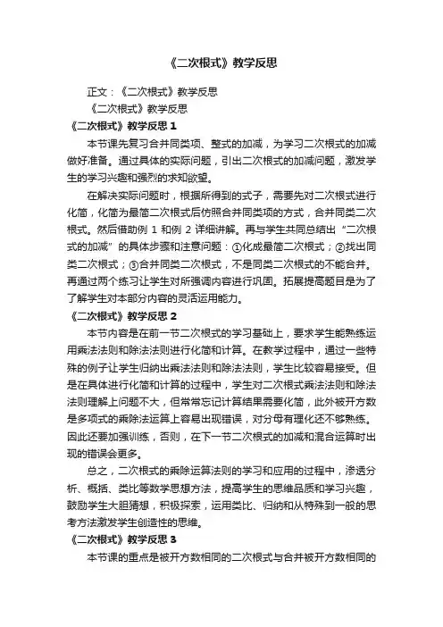 《二次根式》教学反思《二次根式》教学反思15篇《二次根式》教学反思1本课先通过对实际问题的解决来引入二次根式的加减运算,此问题贴近学生生活,易激发学生的学习兴趣。