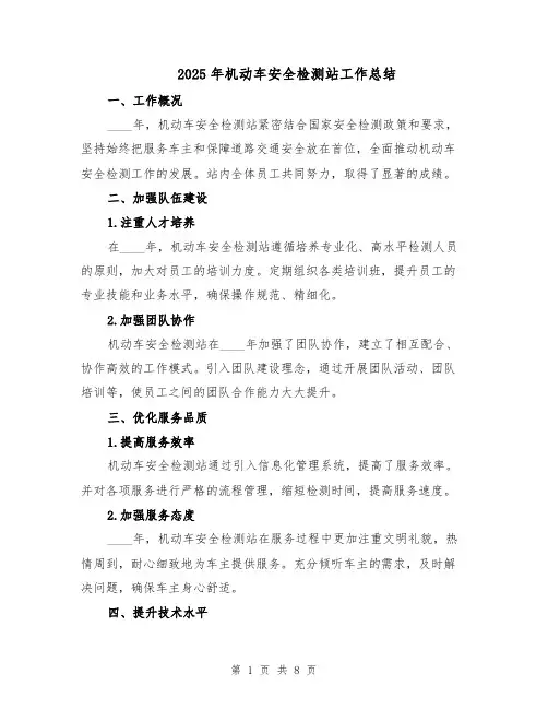 2025年机动车安全检测站工作总结一、工作概况____年,机动车安全检测站紧密结合国家安全检测政策和要求,坚持始终把服务车主和保障道路交通安全放在首位,全面推动机动车安全检测工作的发展。