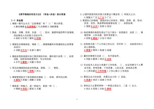 《调节情绪的有效方法》(单选+多选)部分答案(一)单选题1. 情绪一般可以分为“正面情绪”和“()”两大阵营。