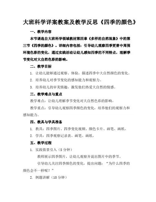 大班科学详案教案及教学反思《四季的颜色》一、教学内容本节课选自大班科学领域教材第四章《多样的自然现象》中的第三节《四季的颜色》。