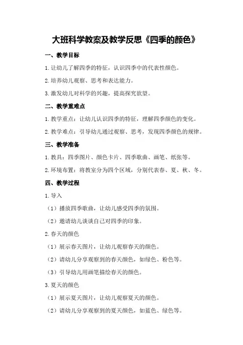 大班科学教案及教学反思《四季的颜色》教学目标1.引导儿童对四季颜色的感知,能够区分春、夏、秋、冬四季的颜色。