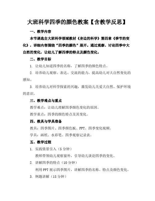 大班科学四季的颜色教案【含教学反思】一、教学内容本节课选自大班科学领域教材《身边的科学》第四章《季节的变化》,详细内容围绕“四季的颜色”展开。
