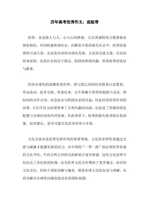 历年高考优秀作文:说纽带纽带,是连接人与人、心与心的桥梁,它以其独特的力量使彼此相依相托,共同构建和谐社会。