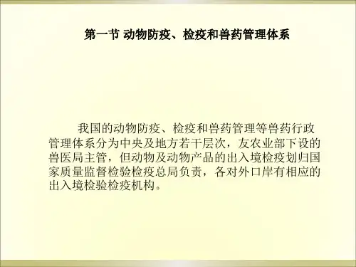 二、兽药管理概述兽医药品(以下简称兽药)是指用于治疗、预防和控制动物疾病,促进动物生长发育的药品,包括化学药品、生物制品、中草药药品。